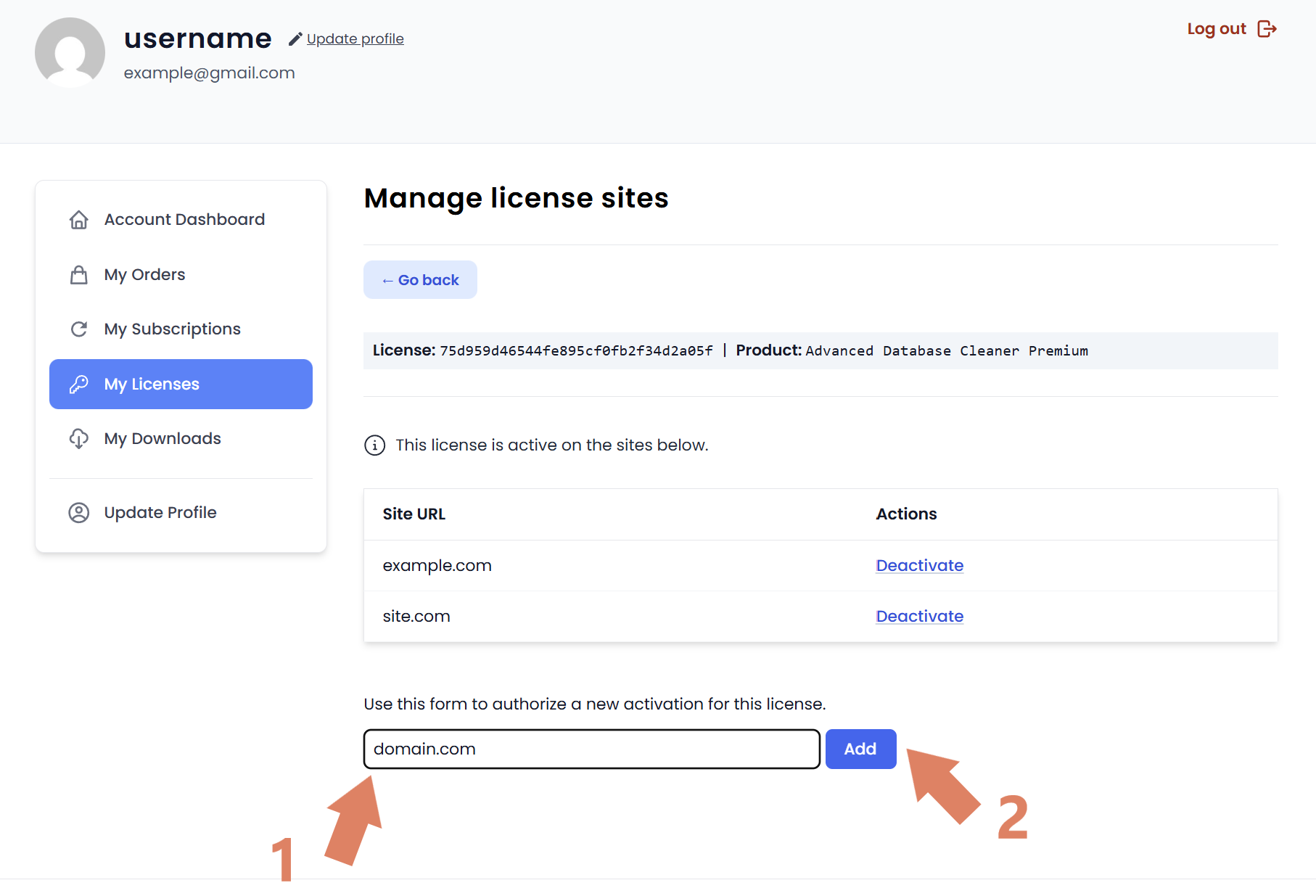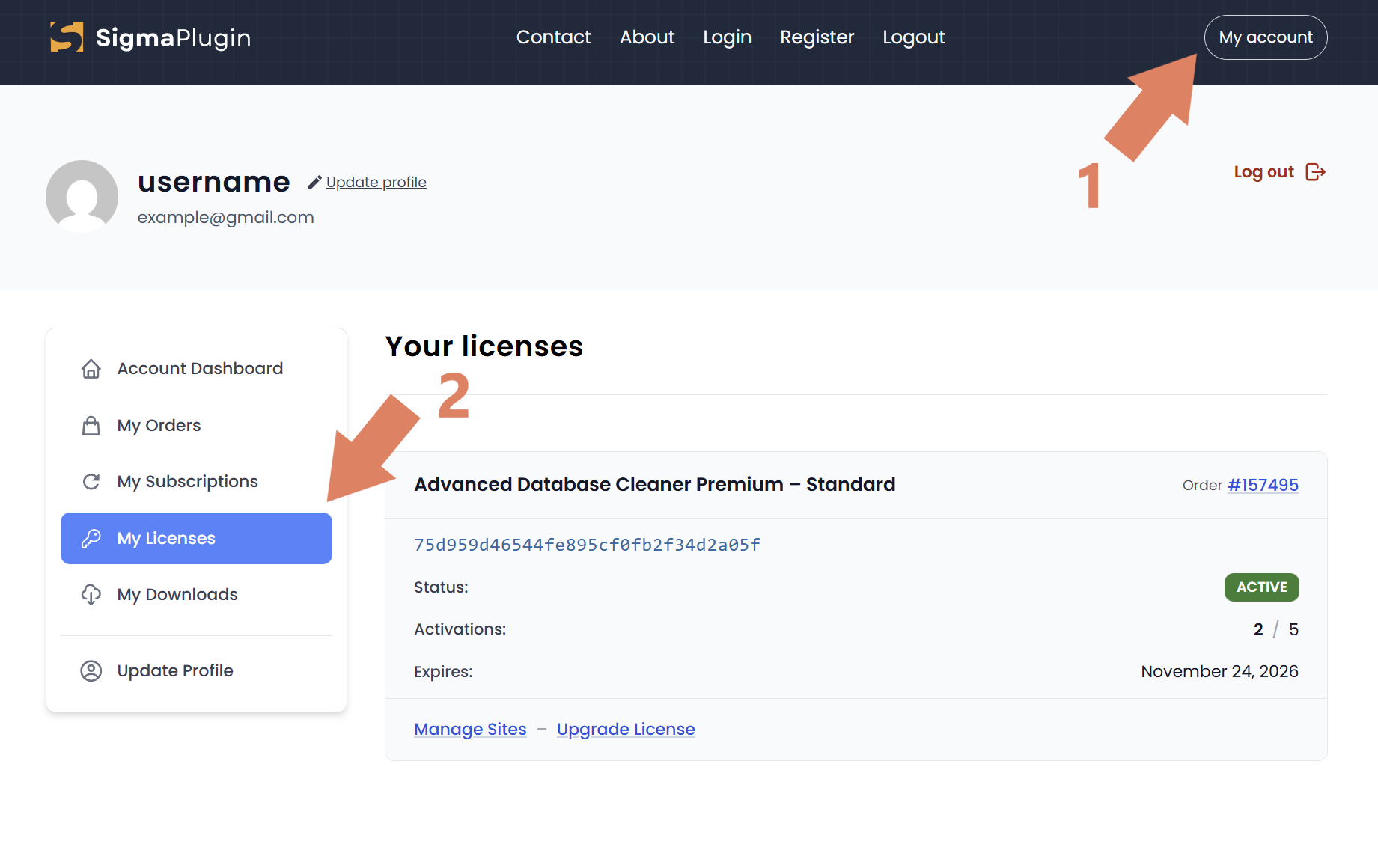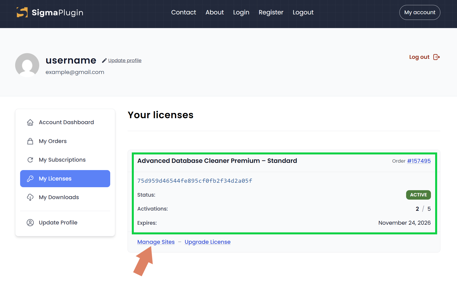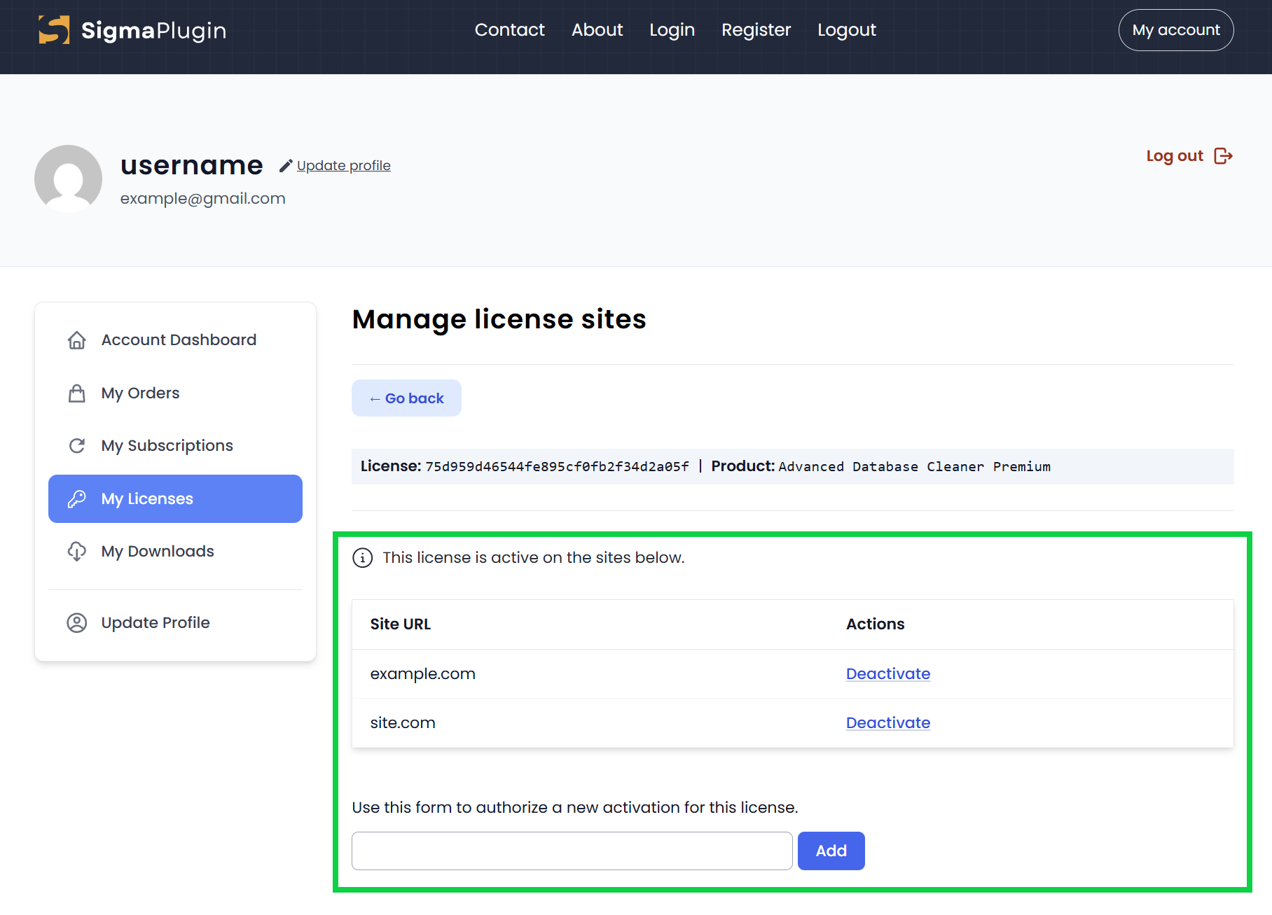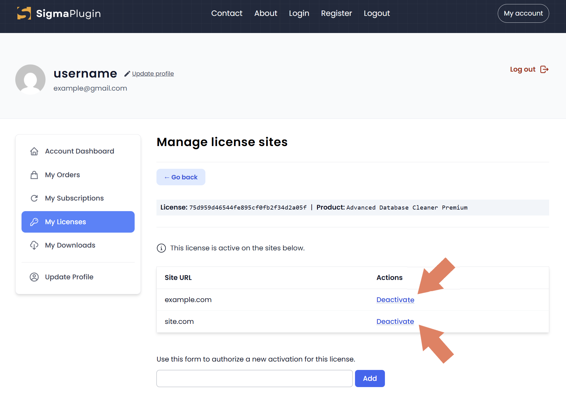 After purchasing Advanced Database Cleaner Premium, you can easily manage your license activations from your SigmaPlugin account.