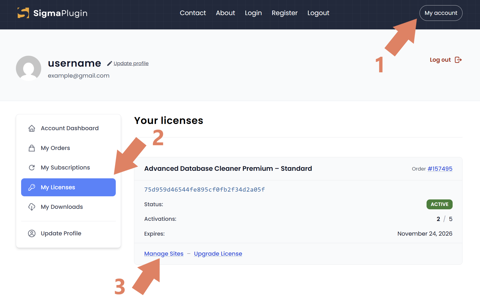 After activating your Advanced Database Cleaner Premium license on one or more sites, you may want to verify where your license is currently in use.
