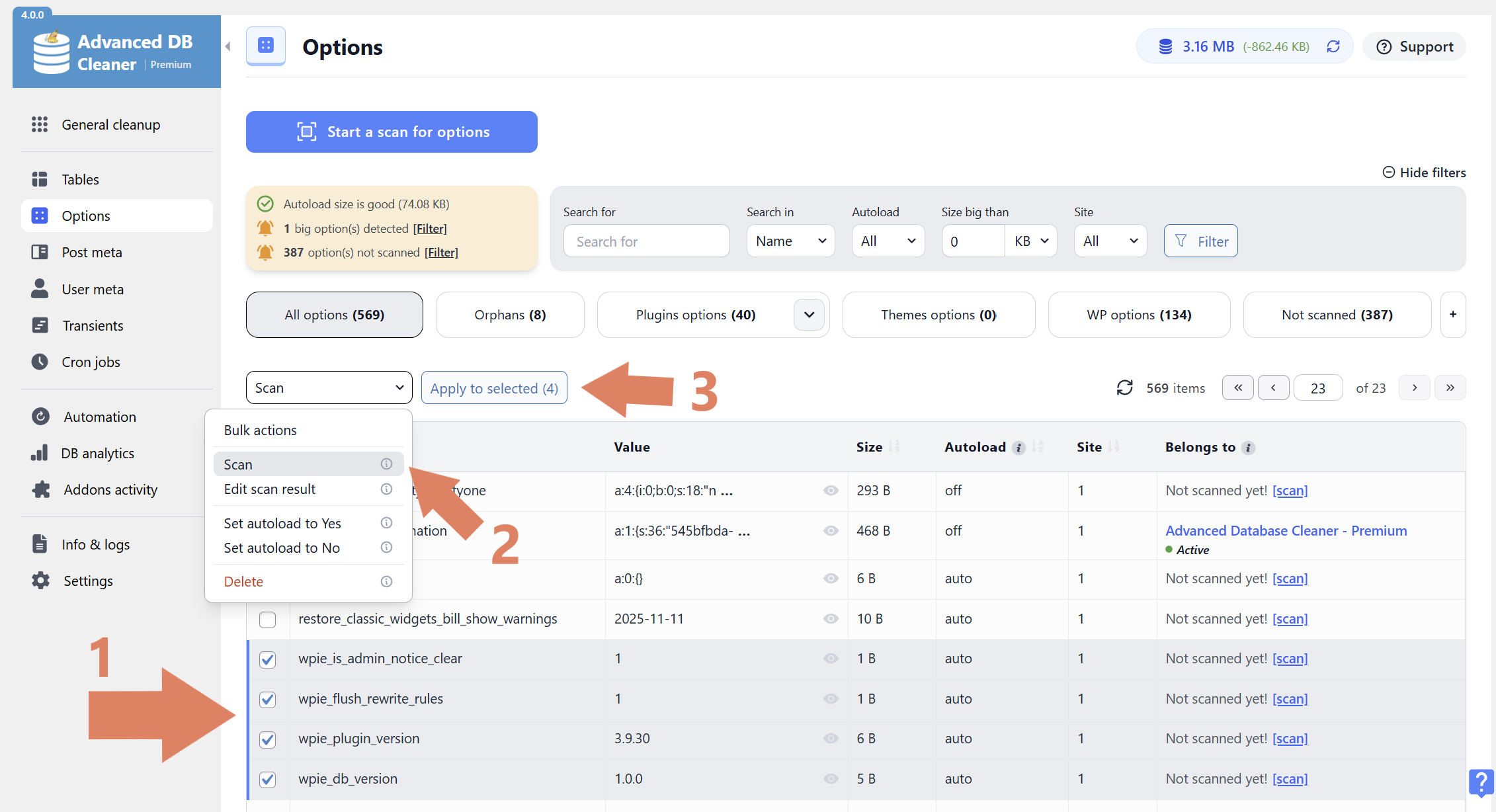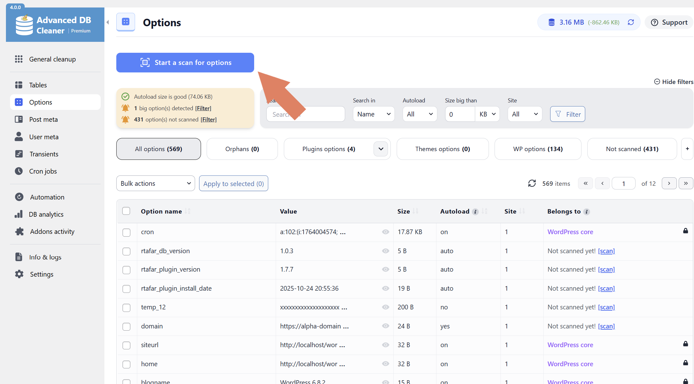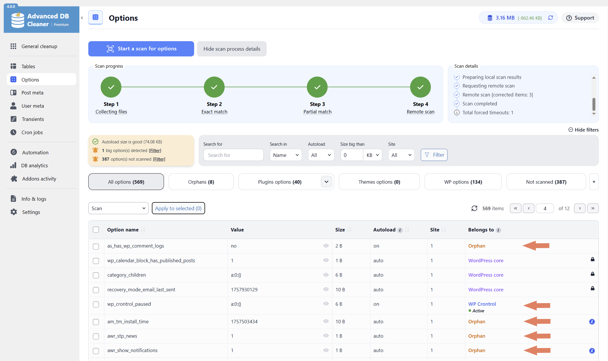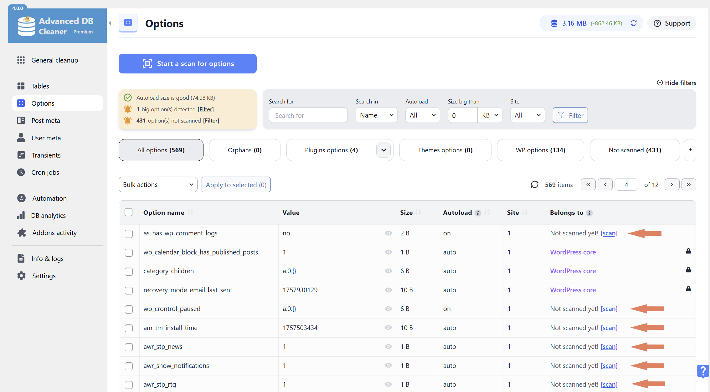 Right after installing Advanced Database Cleaner Premium, most items will display “Not scanned yet!” in the Belongs to column.